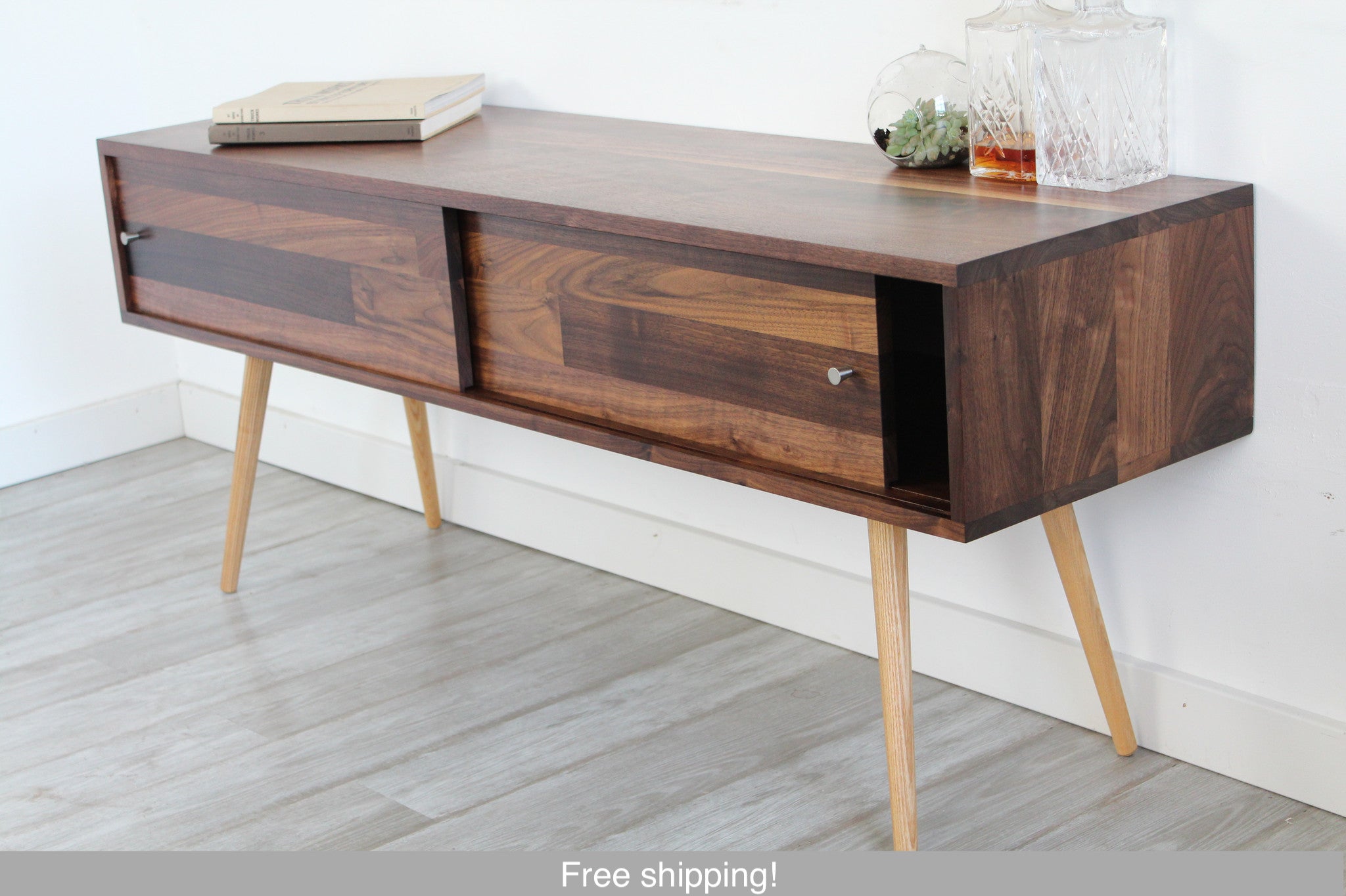 This simple minimal design with solid walnut siding doors, provides perfect storage for all your media gadgets. The back is open for cables and air to flow freely.